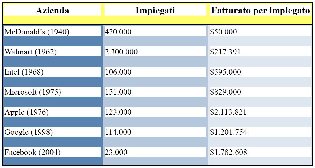 McDonald’s è stata fondata nel 1940, può dunque essere considerata un’azienda anziana, e il fatturato per dipendente è di 50.000 dollari. Man mano che ci avviciniamo a tempi moderni si nota una progressiva diminuzione del numero di lavoratori occupati e un aumento della quantità di ricchezza che ogni dipendete crea (unica eccezione è Walmart; anche se negli ultimi anni anch’essa sta cedendo il passo all’automazione).