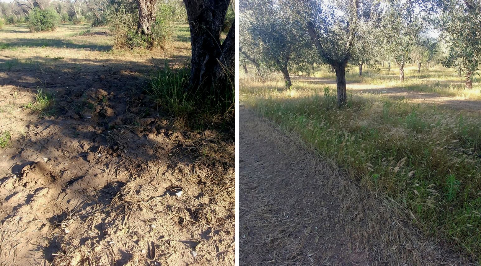 A sinistra un campo sottoposto a sperimentazione Bicc, a destra ulivi trattati con metodi convenzionali