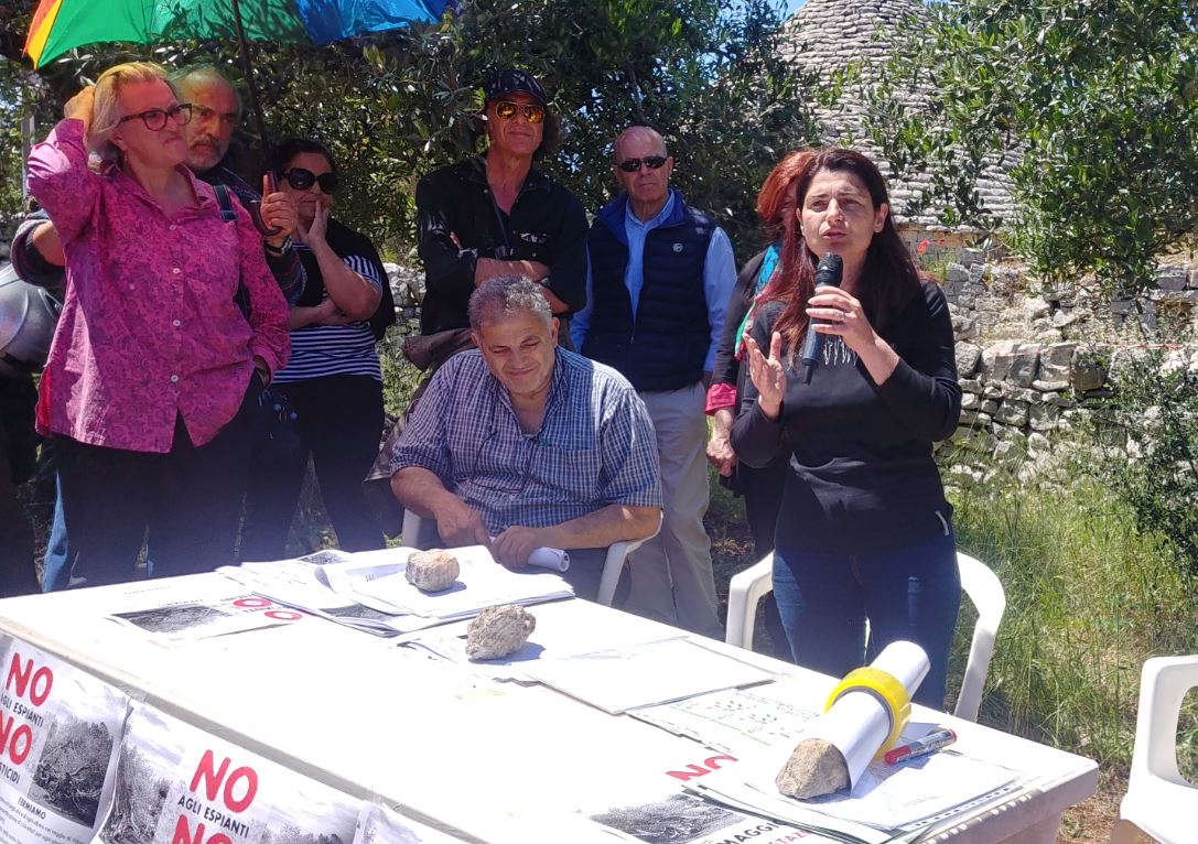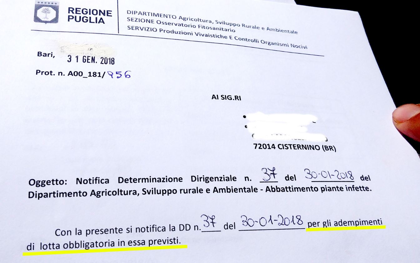 “Questo è l’olivo di contrada da Lamacesare-Termetrio che a settembre dell’anno scorso è stato definito infetto dal batterio Xylella fastidiosa da parte dell’Osservatorio Fitosanitario di Bari. Questa è l’ingiunzione. Questa è la cartina. Non ci si può sbagliare! Come si può vedere l’albero non ha alcun ramo secco. Sono passati quasi 9 mesi dalla segnalazione, ma a differenza di quanto sarebbe dovuto accadere secondo la Regione Puglia e il Cnr, qui non c’è alcun segno di malattia”. A parlare è Angelo Cardone, coltivatore ed esponente del Comitato per la salvaguardia dell’ambiente e del territorio della Valle dell’Itria. “Tanti giornali hanno parlato di segnali evidenti di disseccamento. Di Xylella che avanza. Hanno pubblicato foto di alberi secchi e gialli. Ma la realtà è un’altra”. Siamo a Cisternino e, in effetti, l’olivo che abbiamo davanti è verdissimo. Come tutti quelli attorno. Eppure vorrebbero abbatterli. E in fretta. “Per evitare il contagio, dicono. Dopo 9 mesi nei quali nulla è stato fatto, ora hanno fretta. Perché? Forse il motivo è proprio che queste piante nonostante la presenza del batterio siano sanissime e rappresentino una testimonianza scomoda che dimostra, in pieno campo, che la Xylella non è la causa della malattia degli olivi del Salento”.