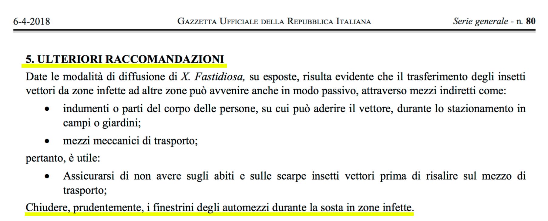 Lo stesso Decreto Martina paradossalmente ne mette in dubbio l’efficacia: “Il solo metodo di diffusione naturale di Xylella è attraverso insetti vettori che generalmente volano a brevi distanze, fino a 100 m, ma è possibile che siano trasportati dal vento ben oltre tale distanza – si legge al punto 3.4 – La diffusione del materiale vegetale infetto e vettori da parte di persone comuni mediante automobili o navi, o attraverso il trasporto di terreno agricolo, devono essere prese in considerazione. La movimentazione di materiale vegetale infetto è considerata la forma più efficace di dispersione a lungo raggio di X. fastidiosa. La diffusione è considerata come molto probabile, con una media incertezza. È difficile delineare i limiti dell’area contaminata. Ciò non influenza però la bassa incertezza generale riguardo alla probabilità di diffusione. È difficile caratterizzare fino a che punto l’epidemiologia e la diffusione nell’area infetta possa essere trasposta in una diffusione potenziale in altre aree”.