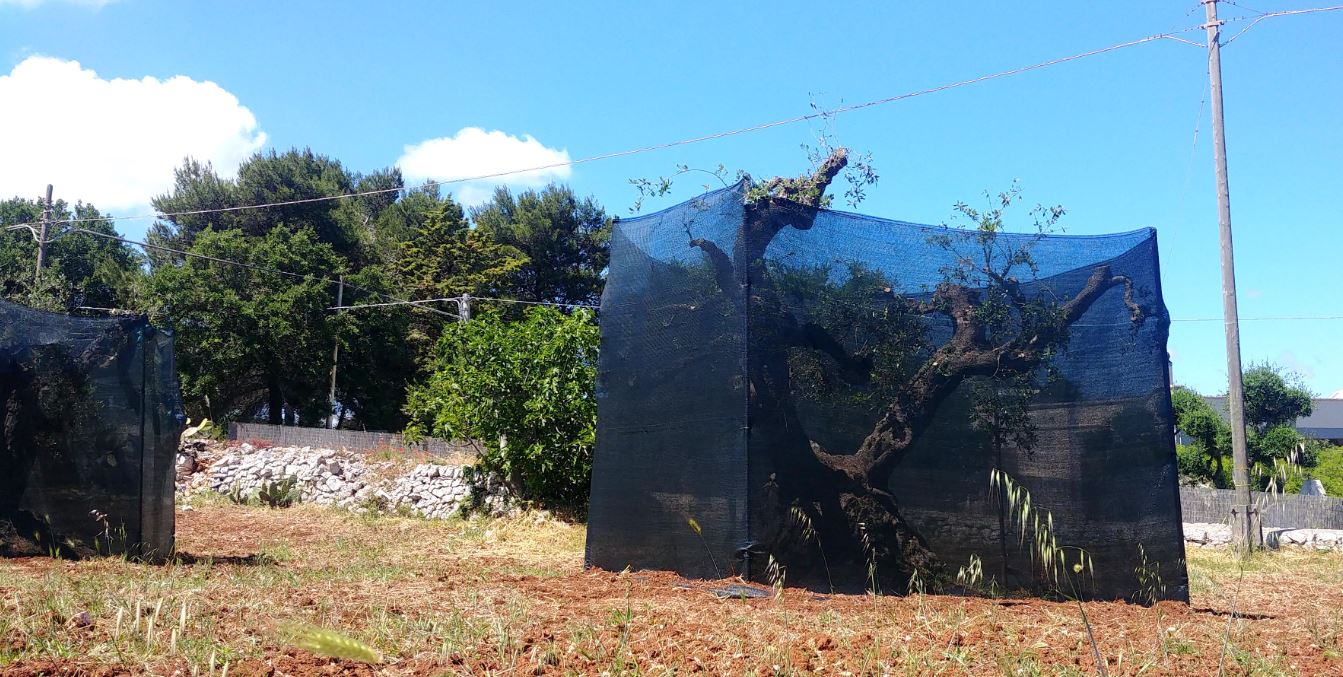 Ulivi capitozzati e contornati da una rete anti-afidi