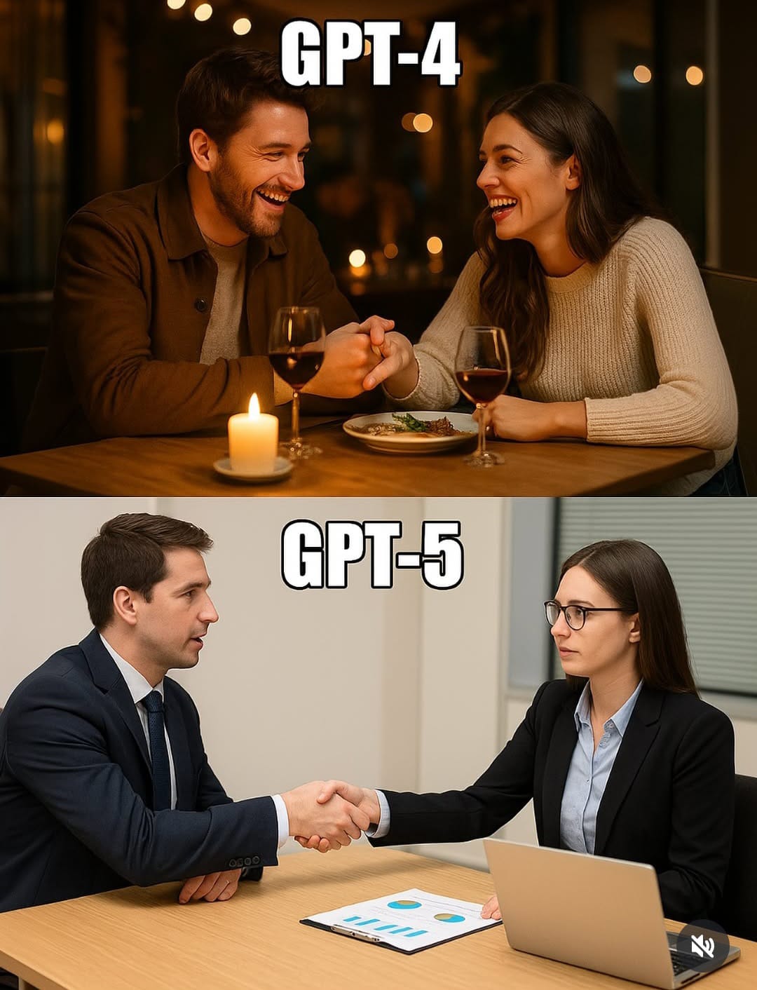 Un esempio di come questo cambiamento sia percepito dagli utenti è una foto circolata su Instagram (e realizzata proprio da ChatGPT) che mette a confronto in modo ironico GPT-4 e GPT-5. Nella parte superiore, GPT-4 è raffigurato come una cena romantica, con sguardi e sorrisi calorosi. Nella parte inferiore, GPT-5 appare in un contesto formale da riunione di lavoro, con una stretta di mano distaccata. L’immagine ha raccolto migliaia di commenti e la frase più ricorrente degli utenti è “mi manca la versione 4 ”. A mancare non è la tecnologia in sé, quello che manca è il calore, anche se simulato, che una macchina può restituire, è il mentouring, il supporto. Questo mostra quanto l’essere umano abbia bisogno di sentirsi “coccolato” e quanto sia disposto a cercare quell’illusione di vicinanza persino in un algoritmo.