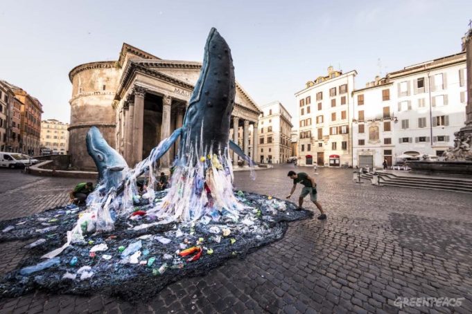 di Greenpeace – Attivisti di Greenpeace hanno montato ieri mattina in pieno centro a Roma, di fronte al Pantheon, una riproduzione a grandezza naturale di due balene alte rispettivamente 6 e 3 metri che emergono da un mare invaso da rifiuti in plastica monouso, per denunciare come i nostri mari, e le specie che in essi vivono, siano in grave pericolo a causa dell’uso smodato di plastica usa e getta e dell’inquinamento che ne deriva.
