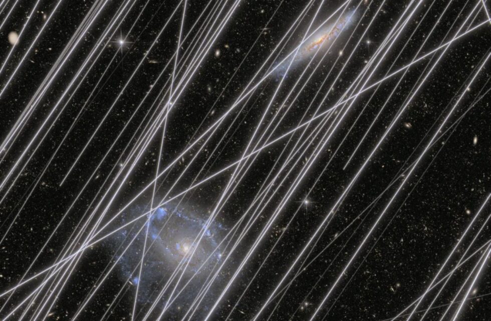 Nella foto un’immagine simulata che rappresenta la contaminazione proiettata dalle scie satellitari in uno dei futuri telescopi spaziali. Le strisce di luce riflesse dai satelliti artificiali per le telecomunicazioni mettono in ombra l’immagine altrimenti incontaminata di due galassie che interagiscono sullo sfondo. Immagine: NASA / Borlaff, Marcum, Howell (Nature, 2025)