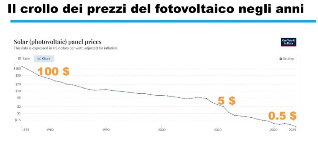 Il modo più rapido ed economico per produrre energia elettrica è oramai tramite le rinnovabili. I prezzi dei pannelli fotovoltaici per kW sono calati di venti volte tra il 1975 e il 2010, e si sono ridotti di oltre il 90% negli ultimi 15 anni. Nel frattempo, l’efficienza è passata dal 12-13% al 20-25% di oggi.