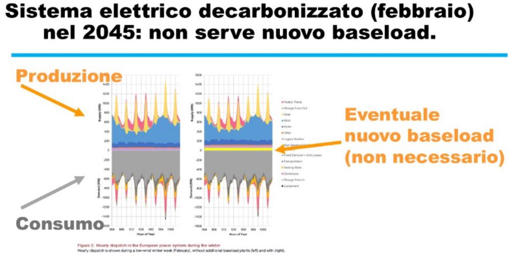 Questo perché la sovrapproduzione delle rinnovabili in alcune ore del giorno può essere trasferita poi al picco serale tramite batterie, interconnessioni tra le reti e produzione di idrogeno da rinnovabili. La loro analisi si concentra in particolare su un mese (febbraio in Germania) quando c’è poco vento e poca luce. Eppure, anche in questo caso non sarebbe necessario avere nuovo carico di base. Con le rinnovabili, si può avere sicurezza energetica, e decarbonizzazione.