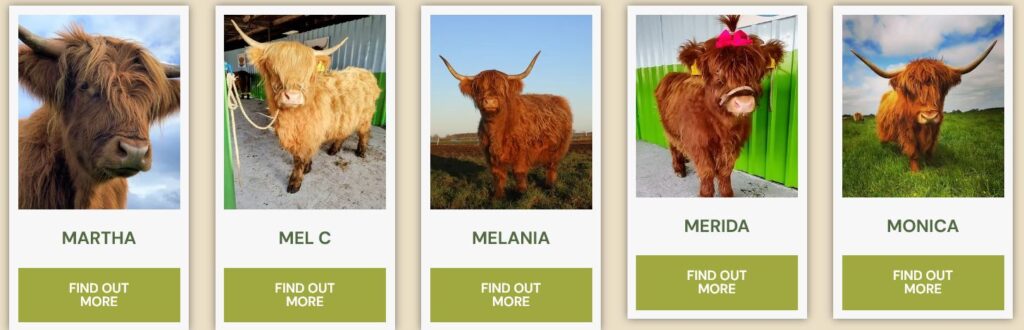 A questa iniziativa si è aggiunta anche la possibilità di adottare una mucca Highland tramite il sito dell’azienda. Esistono diversi livelli di adozione, con prezzi da 25 a 105 sterline l’anno (da 29 a 104 euro). I sostenitori ricevono aggiornamenti personalizzati sulla mucca scelta, accesso a contenuti digitali attraverso un diario online chiamato MooBook, e in alcuni pacchetti anche oggetti come peluche, borracce o adesivi. Ogni contributo aiuta direttamente il finanziamento dei progetti di conservazione in corso. Le mucche sono presentate con nome, caratteristiche e fotografie, e ogni adozione contribuisce a mantenere un rapporto attivo tra la fattoria e chi partecipa da lontano.