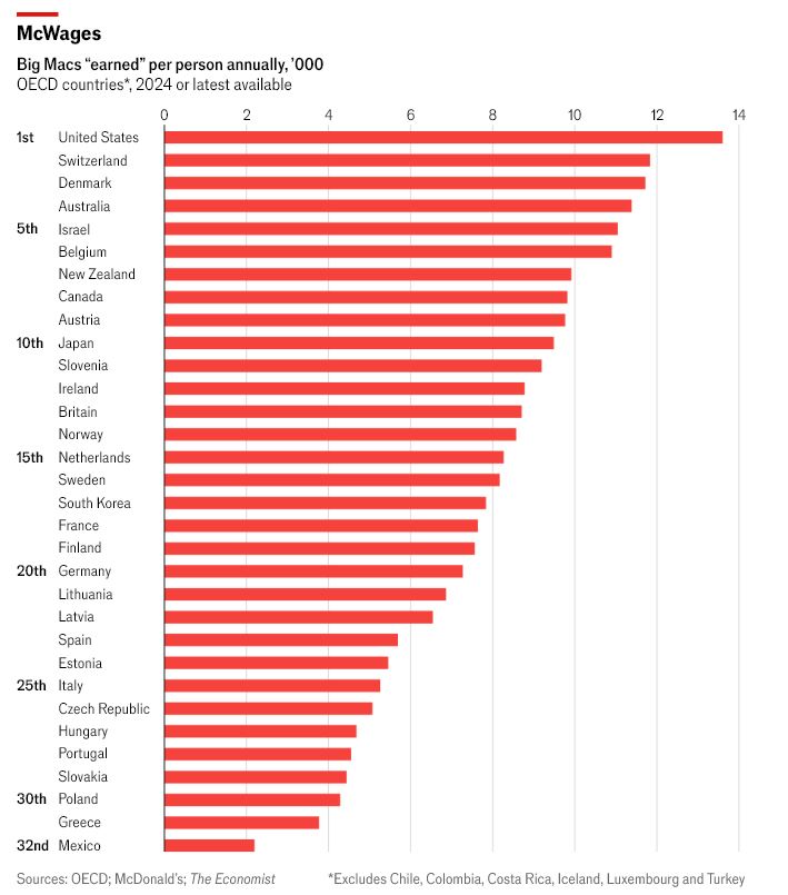 In termini di stipendio annuo, gli americani sono quelli che ottengono il massimo in termini di hamburger per ogni dollaro speso. Con uno stipendio medio si possono acquistare ben 13.601 Big Mac all’anno, ovvero 1.775 hamburger in più (o 10 milioni di calorie in più) rispetto alla Svizzera, al secondo posto. Ma gli americani lavorano anche più ore dei loro colleghi europei. Su base oraria, la Danimarca è in testa all’indice McWages, con 8,5 Big Mac all’ora lavorata, rispetto ai 7,7 della Svizzera e ai 7,6 degli Stati Uniti. Questa classifica regge bene rispetto alle classifiche di prosperità più convenzionali, come la nostra guida ai paesi più ricchi del mondo, che utilizza misure del PIL e della parità di potere d’acquisto.