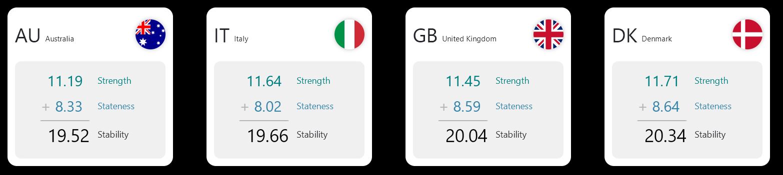 Ogni stato riceve un punteggio per la sua stabilità e governance, misurando quanto è stabile, duraturo e affidabile. La Svizzera è al primo posto. Gli Stati Uniti sono al sesto. Singapore è tra i primi dieci. Ciò che rende particolarmente interessanti i nostri risultati è che forniscono il primo indice che non è influenzato solo dalle dimensioni, ma considera anche la qualità. In altre parole, non si tratta solo di un tradizionale ranking di potenza.