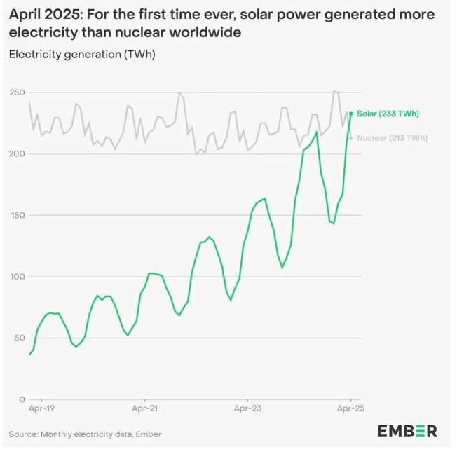Aprile 2025. Segnatevi questa data. A livello globale, l’energia elettrica ottenuta da fotovoltaico ha superato quella da nucleare. 235 TWh contro 213 TWh. L’energia elettrica prodotta da nucleare ogni mese varia nella forbice 200-250 TWh e ristagna da molti anni, perché i nuovi reattori che si costruiscono, essenzialmente di fabbricazione cinese e russa, riescono appena a bilanciare quelli dismessi per raggiunti limiti di età.